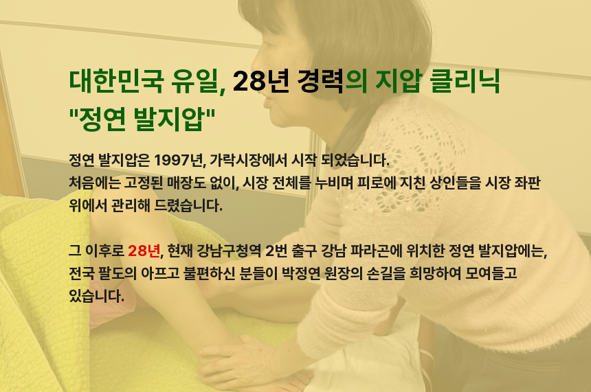 안녕하세요. 서울 강남에서 28년간 정연발지압을 운영해 온 원장 박정연입니다.