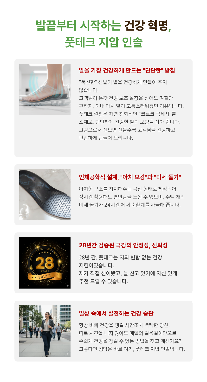 신는 순간, 발바닥에서부터 머리끝까지 전해지는 개운함을 느껴보세요. 28년 전통의 노하우가 당신의 발걸음을 가볍게 만들어 드릴 것입니다.