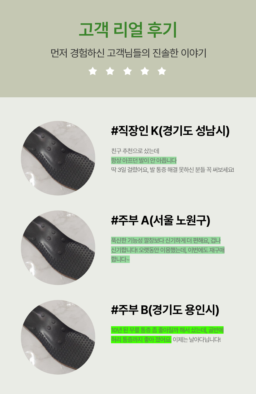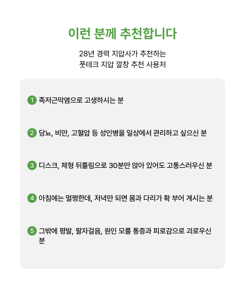 - 추천 대상: 장시간 서서 일하는 직업군(교사, 간호사, 서비스직), 족저근막염으로 고생하시는 분, 평발로 인해 조금만 걸어도 피곤하신 분.